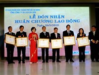 | Đại diện các tập thể, cá nhân của các đơn vị trực thuộc Tổng công ty Du lịch Sài Gòn nhận huân chương lao động-Ảnh: Đào Loan |