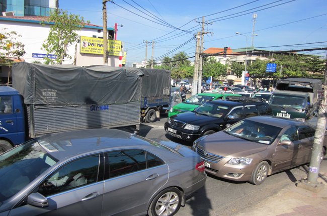 | Đường Phan Thúc Duyện chạy qua công viên Hoàng Văn Thụ ùn ứ xe kéo dài do phân làn đường để thi công cầu vượt - Ảnh: Anh Quân |