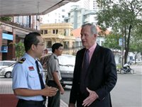 Ông Jack Donohue (phải) nói chuyện với nhân viên của Công ty dịch vụ bảo vệ Long Hải trong bộ đồng phục mới của công ty trước buổi lễ công bố Securitas là cổ đông nước ngoài của công ty ngày 20-4 - Ảnh: Mộng Bình