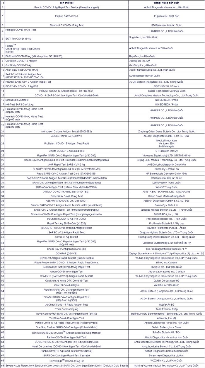 Theo danh sách cập nhật của Vụ Trang thiết bị và Công trình y tế, tính đến thời điểm hiện tại, cả nước có 30 loại test nhanh kháng thể và 83 loại test nhanh kháng nguyên đã được Bộ Y tế cấp phép. Đối với test nhanh kháng nguyên, trong nước có 3 sản phẩm hàng Việt Nam và 80 loại nhập khẩu từ nước ngoài (trong đó có 69 test nhanh, 11 test chạy máy miễn dịch).