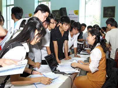 Nhiều sinh viên đăng ký mở tài khoản ảo trong buổi giới thiệu chương trình "nhà đầu tư Sacombank" và "dự đoán VN-Index sáng ngày 24-6. Ảnh: Việt Nga |