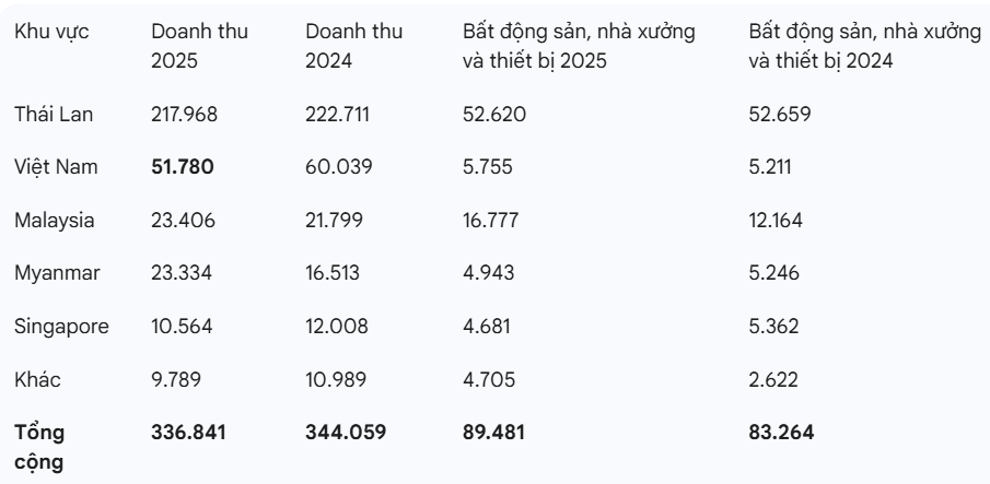 Theo báo cáo tài chính năm 2025 (niên độ tháng 10-2024 đến tháng 9-2025), doanh thu hợp nhất của Thai Beverage Public Company Limited (ThaiBev) đạt 336.841 triệu baht, giảm 7.200 triệu baht so với cùng kỳ. Riêng thị trường Việt Nam ghi nhận mức sụt giảm từ 60.039 triệu baht xuống còn 51.780 triệu baht, tức giảm 8.260 triệu baht - tương đương gần 7.000 tỉ đồng khi quy đổi. ThaiBev cho biết nguyên nhân chủ yếu đến từ sự mất giá của đồng Việt Nam so với đồng baht, khiến doanh thu quy đổi chịu tác động bất lợi.