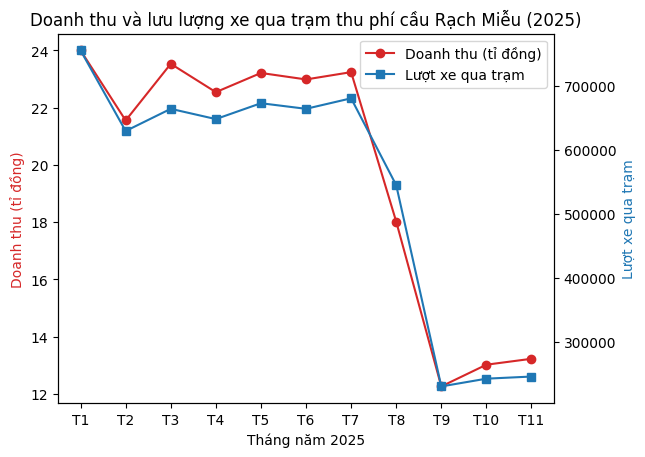 Báo cáo của DRVN, cho thấy thời điểm tháng 8-2025 (cầu Rạch Miễu 2 khai thác từ ngày 19-8-2025), trạm thu phí cầu Rạch Miễu ghi nhận doanh thu đạt 18,018 tỉ đồng với số lượng xe lưu thông 544.849 lượt; sang tháng 9-2025 đạt 7,848 tỉ đồng doanh thu và 275.125 lượt xe qua trạm; tháng 10 lần lượt đạt 7,46 tỉ đồng và 265.602 lượt xe qua trạm thu phí cầu Rạch Miễu.