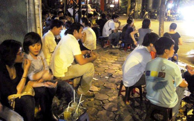 | Đông đảo bạn trẻ uống trà chanh ở khu phố Nhà thờ Lớn vào buổi tối - ảnh: Tô Nhàn |