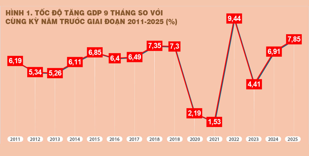 Xét theo cơ cấu ngành, công nghiệp và xây dựng tăng 9,46%, nông - lâm - thủy sản tăng 3,83%, trong khi dịch vụ tăng 8,55%. Tính chung chín tháng đầu năm, GDP tăng 7,85%, tiến gần mục tiêu năm 2025 tăng khoảng 8% mà Chính phủ đặt ra. Những con số này cho thấy đà tăng trưởng của nền kinh tế Việt Nam đang diễn ra mạnh mẽ và theo đúng hướng.