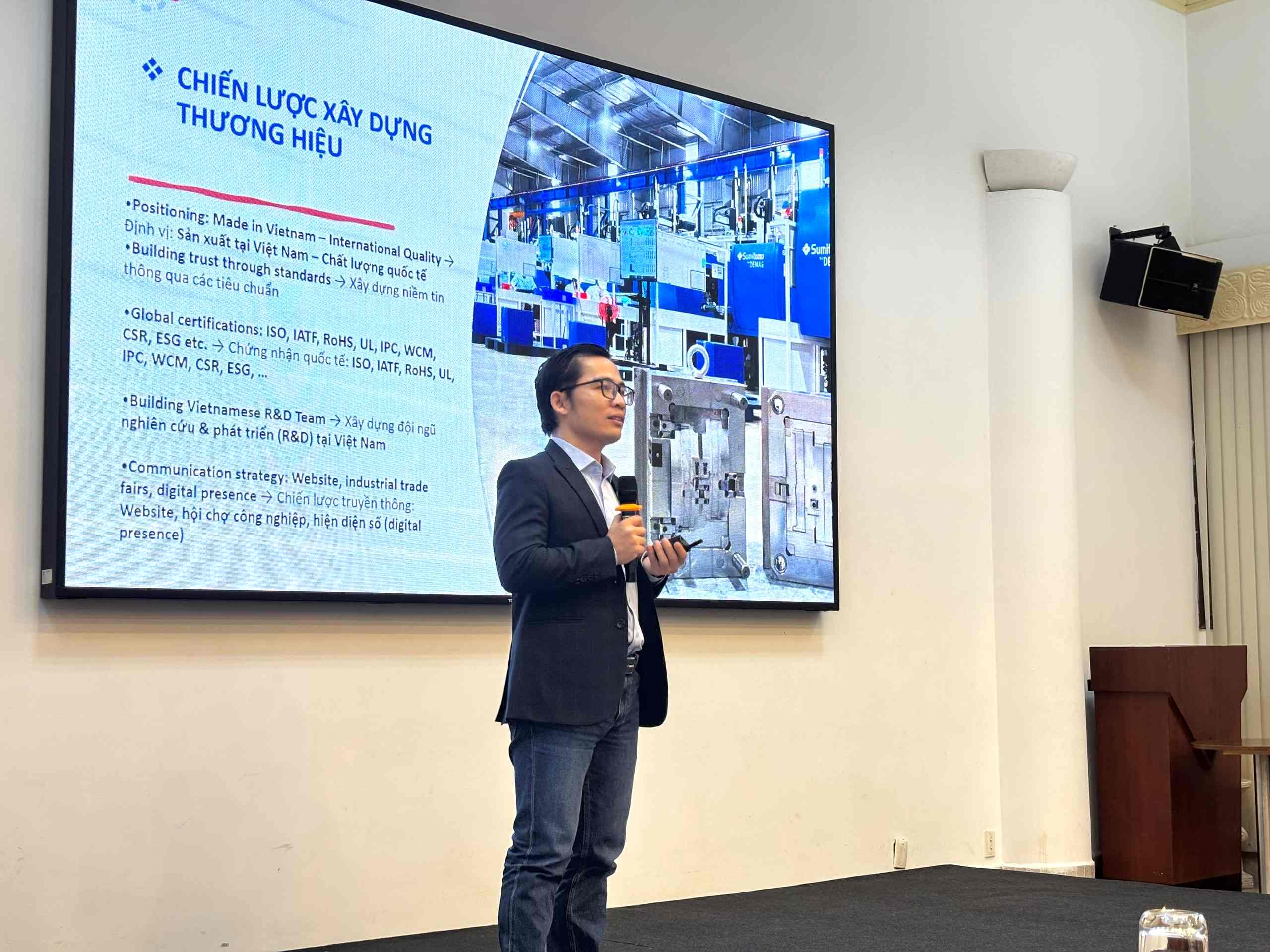 Ở góc độ doanh nghiệp, ông Bùi Đức Thọ, Tổng giám đốc Airspeed Manufacturing Việt Nam, đã trình bày bài tham luận “Kinh nghiệm thực tiễn: Xây dựng thương hiệu và hành trình chinh phục thị trường quốc tế”. Ông Thọ đã dùng chính câu chuyện của doanh nghiệp để chia sẻ về hành trình một doanh nghiệp sản xuất tại Việt Nam xây dựng định vị thương hiệu “Made in Vietnam – International Quality”, tức sản xuất tại Việt Nam với chất lượng quốc tế.