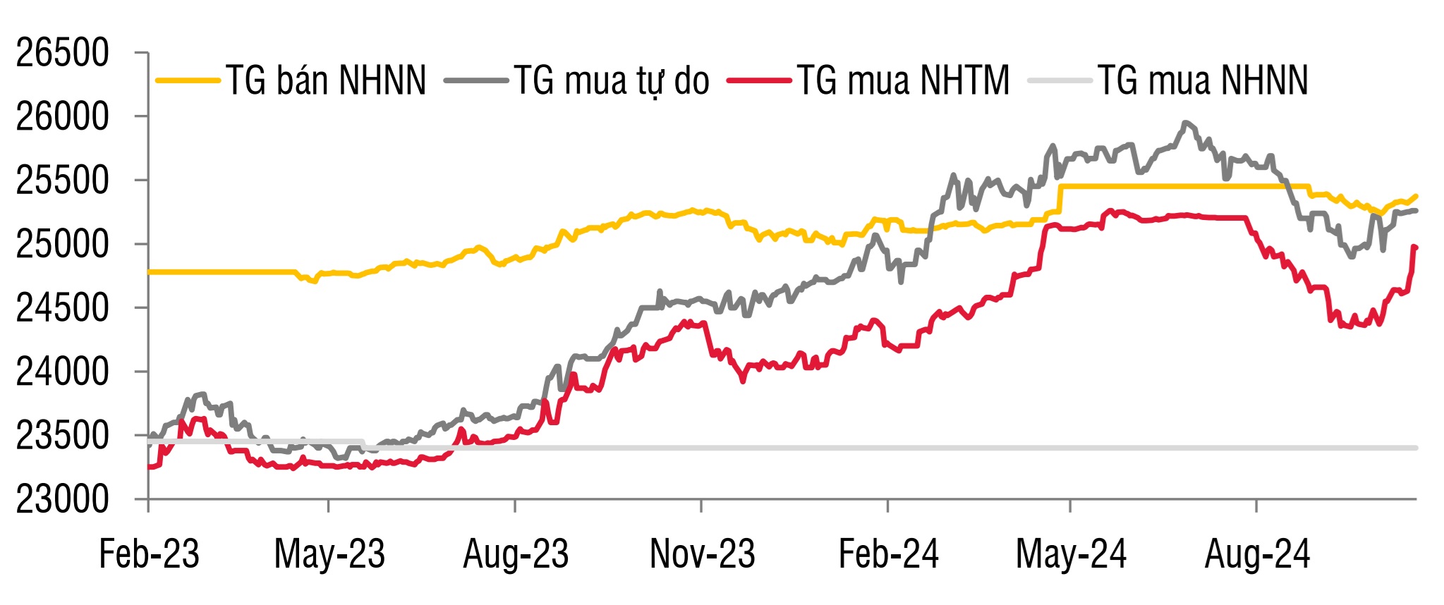 Trong tuần trước, tỷ giá liên ngân hàng cũng như tại các ngân hàng thương mại tăng mạnh 1,46%, tương đương mức tăng 2,9% so với cuối tháng 9 và 3,7% so với cuối năm 2023, theo báo cáo cập nhật của Công ty chứng khoán SSI. Tuy nhiên, có một điểm tích cực là tỷ giá trên thị trường tự do vẫn ghi nhận mức tăng thấp (chỉ 0,1% so với tuần trước đó), cũng như chênh lệch giữa hai thị trường cũng được thu hẹp lại.