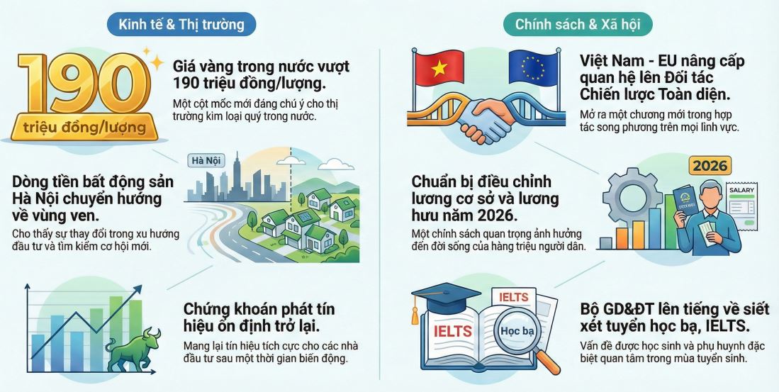 (KTSG Online) - Giá vàng trong nước lập đỉnh mới, quan hệ Việt Nam – EU được nâng cấp, dự án điện khí LNG Cà Ná chốt nhà thầu, thị trường tiêu dùng bị siết trước Tết, chính sách tiền lương chuẩn bị điều chỉnh, chứng khoán ổn định trở lại, cùng các động thái mới về bất động sản, giáo dục và an toàn thực phẩm là những điểm nhấn đáng chú ý trong ngày 29-1.