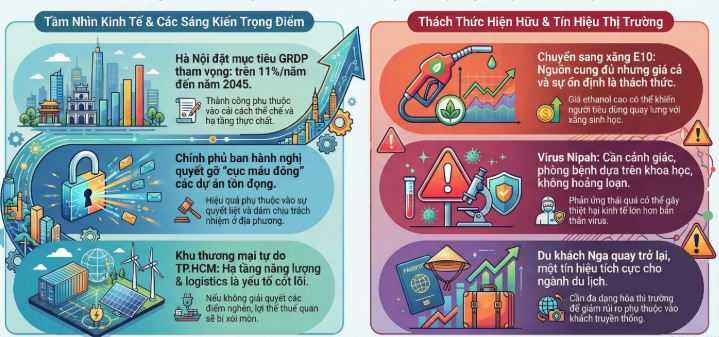 (KTSG Online) - Mục tiêu tăng trưởng tham vọng của Hà Nội, Chính phủ nỗ lực tháo gỡ các dự án tồn đọng, lộ trình xăng sinh học E10, bài toán hạ tầng cho khu thương mại tự do TPHCM, cảnh báo y tế với virus Nipah và tín hiệu phục hồi từ du khách Nga là những điểm nhấn kinh tế – chính sách đáng chú ý hôm nay.