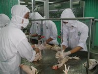 | Giết mổ gà tập trung tại Tổng công ty nông nghiệp Sài Gòn. Thịt gà trong nước đang bị gà ngoại nhập lấn át -Ảnh: HỒNG VĂN |