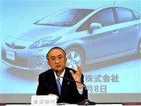 | Chủ tịch tập đoàn Toyota Katsuaki Watanabe công bố kết quả kinh doanh đáng thất vọng của Toyota tại cuộc họp báo cuối tuần qua. Ảnh AP |