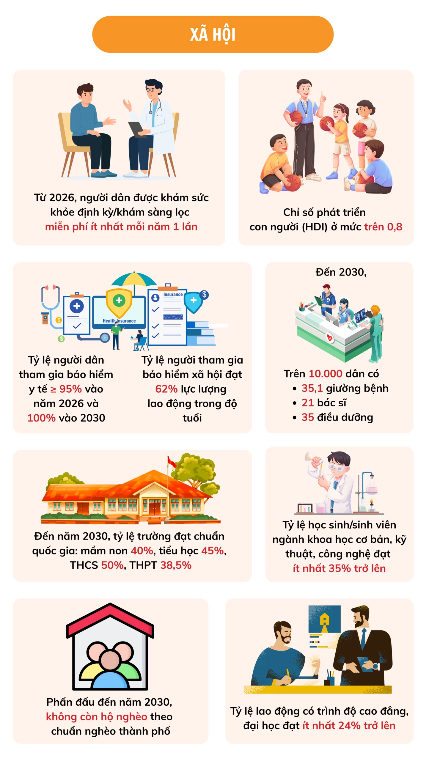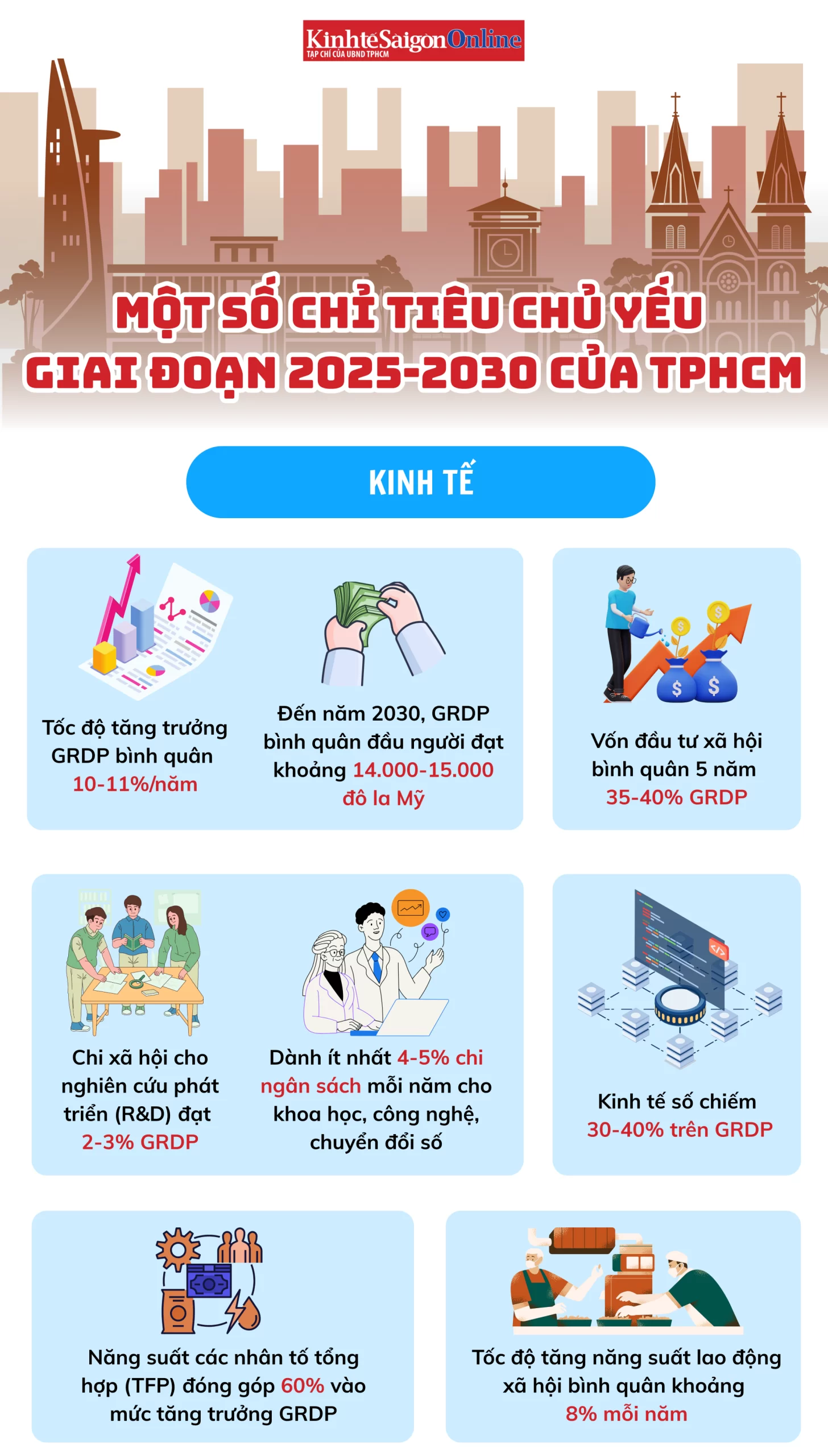 (KTSG Online) - Theo Nghị quyết Đại hội đại biểu Đảng bộ TPHCM lần I, nhiệm kỳ 2025-2030, thành phố đề ra nhiều chỉ tiêu phát triển, gồm tốc độ tăng trưởng GRDP bình quân 10-11%/năm; đến năm 2030, GRDP bình quân đầu người đạt khoảng 14.000-15.000 đô la Mỹ và chỉ số phát triển con người (HDI) ở mức trên 0,8.