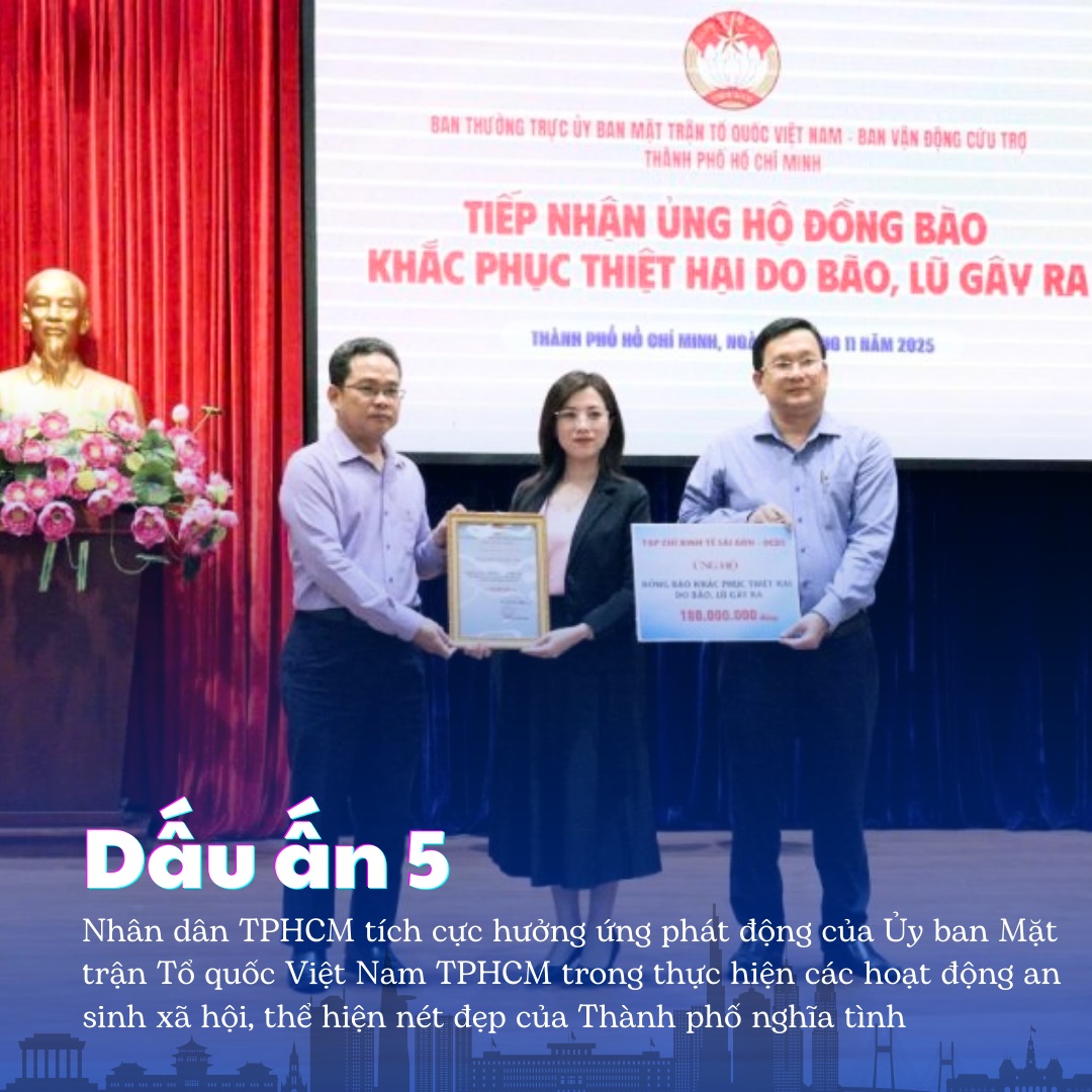 Công tác chăm lo an sinh xã hội được xác định là điểm nhấn xuyên suốt trước, trong và sau Đại hội đại biểu Mặt trận Tổ quốc Việt Nam và Đại hội các tổ chức chính trị - xã hội Thành phố lần thứ I, nhiệm kỳ 2025 - 2030. Đặc biệt, với tinh thần “TPHCM - Vì cả nước, cùng cả nước”, nhân dân Thành phố cũng đã tích cực đóng góp sức người, sức của với hơn 340 tỉ đồng để ủng hộ đồng bào bão lũ miền Trung và miền Bắc khắc phục thiệt hại do bão, lũ gây ra trong năm 2025, lan tỏa mạnh mẽ phẩm chất nghĩa tình của người dân Thành phố mang tên Bác. Thực hiện chỉ đạo của Bộ Chính trị về khắc phục hậu quả mưa lũ tại khu vực Trung Bộ, lãnh đạo TPHCM đã tổ chức các đoàn đến thăm hỏi và chuyển 50 tỉ đồng, hơn 2.900 tấn nhu yếu phẩm, 10.000 áo phao, 10.000 túi thuốc và huy động lực lượng y tế, tình nguyện viên, phương tiện vận tải, cơ giới và trang thiết bị để hỗ trợ nhân dân tỉnh Khánh Hòa khắc phục thiệt hại.