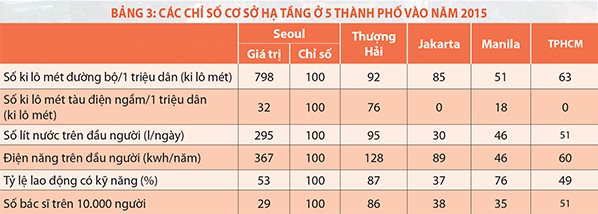 Bảng 3 là một số chỉ tiêu cận cảnh về hạ tầng của TPHCM so với một số đô thị khác. Về cơ bản, thành phố có một số chỉ tiêu gần với Jakarta và Manila và rất xa so với Thượng Hải và Seoul.