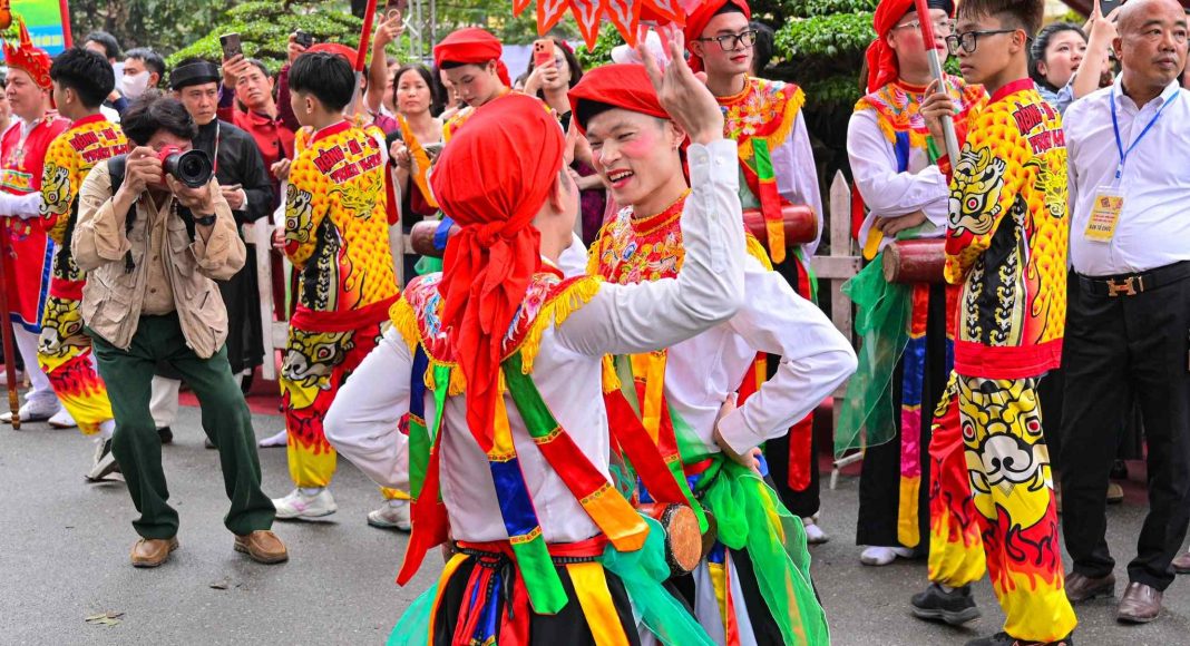 Lễ hội được tổ chức hằng năm nhằm tưởng nhớ Phùng Hưng – vị anh hùng dân tộc lãnh đạo cuộc khởi nghĩa chống ách đô hộ phương Bắc vào thế kỷ thứ 8. Ảnh: Vương LộcKhông khí làng quê rộn ràng từ sáng sớm với tiếng trống, tiếng chiêng, các nghi thức rước kiệu, dâng hương diễn ra trang nghiêm tại đình làng. Ảnh: Vương LộcNhững đoàn rước trong trang phục truyền thống, cờ hội rực rỡ tái hiện không gian lễ hội cổ truyền đặc trưng của vùng Bắc Bộ. Ảnh: Vương LộcĐiểm nhấn của lễ hội là điệu múa “con đĩ đánh bồng” – một trong những điệu múa cổ độc đáo của làng Triều Khúc. Ảnh: Vương LộcNgười biểu diễn là các chàng trai chưa vợ trong làng, hóa trang thành nữ với áo yếm, váy lĩnh, khăn mỏ quạ và trống bồng. Ảnh: Vương LộcTheo truyền tích dân gian, điệu múa này ra đời khi nghĩa quân của Phùng Hưng đóng quân tại Triều Khúc. Để khích lệ tinh thần binh sĩ, ông cho quân giả gái múa hát tạo không khí vui tươi trước giờ xuất trận. Ảnh: Vương LộcDần dần, tiết mục ấy trở thành nghi thức đặc trưng trong lễ hội làng, được lưu truyền qua nhiều thế hệ như một cách nhắc nhớ về hào khí chống ngoại xâm. Ảnh: Vương Lộc