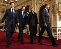 | (từ trái sang) Tổng thống Pháp N. Sarkozy, Thủ tướng Đan Mạch A. F. Rasmussen, Thủ tướng Đức A. Merkel và Tổng thống Mỹ B. Obama tại lễ kỷ niệm 60 năm thành lập NATO vào hôm qua 3-4-3009. Ảnh AP |