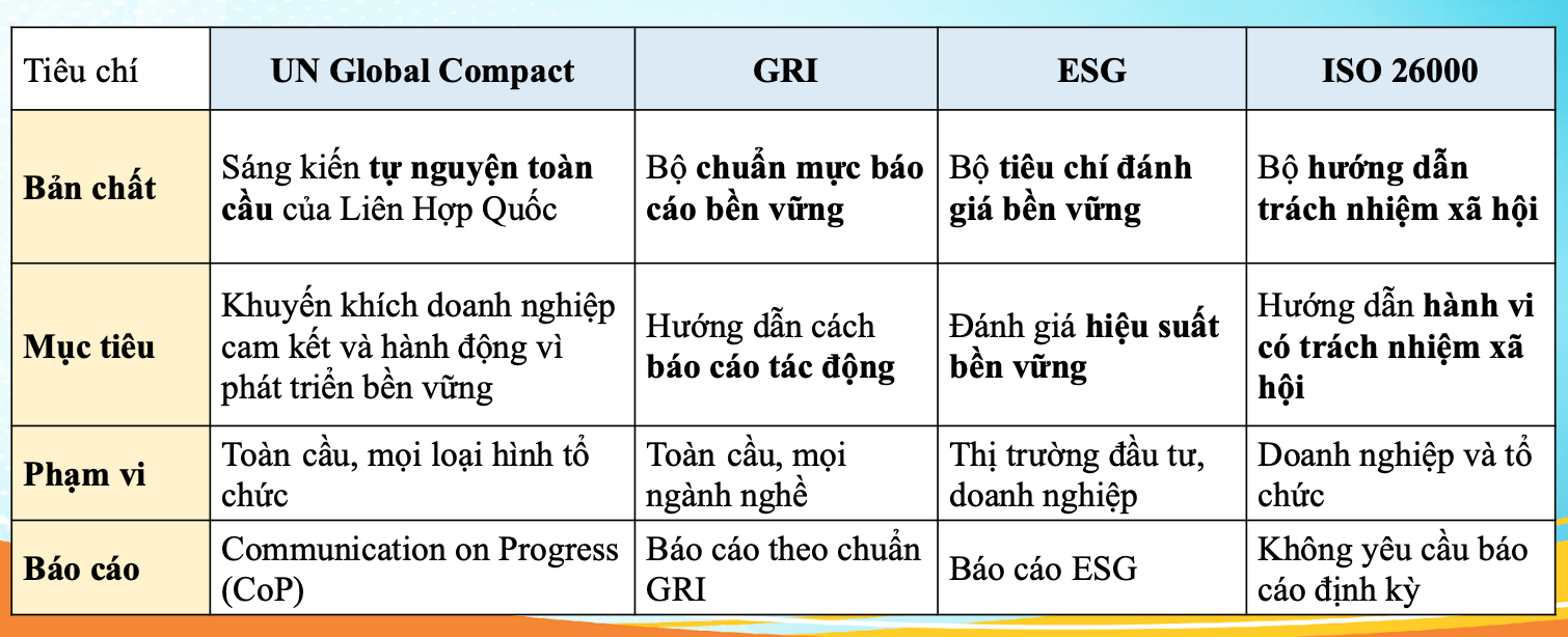 Trong xu thế toàn cầu thúc đẩy kinh doanh có trách nhiệm, các tổ chức quốc tế đã xây dựng nhiều bộ tiêu chí và hướng dẫn đánh giá nhằm giúp doanh nghiệp đo lường, quản lý và công khai các tác động xã hội, môi trường trong quá trình hoạt động.