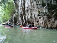 | Du khách ngoại quốc chèo thuyền kayak tham quan hồ Ba Bể. Ảnh: Lâm Văn Sơn |