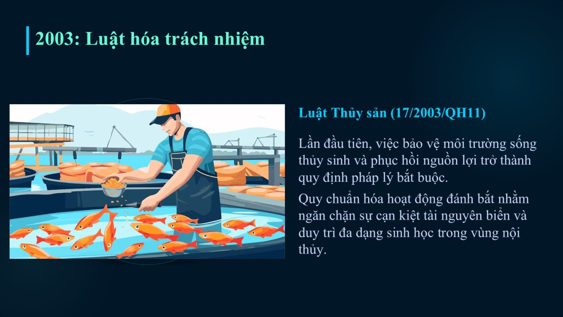Luật Thủy sản 2003 đã bãi bỏ Pháp lệnh bảo vệ và phát triển nguồn lợi thủy sản năm 1989, thay thế bằng một cơ chế quản lý nhà nước chặt chẽ hơn về khu bảo tồn biển và các vùng nước nội thủy, lãnh hải. Tuy nhiên, công bằng mà nói, giai đoạn 2000-2010 vẫn mang đậm tính chất “vừa làm vừa học”. Các nỗ lực bảo vệ đại dương lúc đó chủ yếu tập trung vào việc ngăn chặn các phương thức đánh bắt hủy diệt và quản lý cường lực khai thác trong phạm vi gần bờ, chưa thực sự chạm tới các vấn đề mang tính hệ sinh thái và xuyên biên giới.