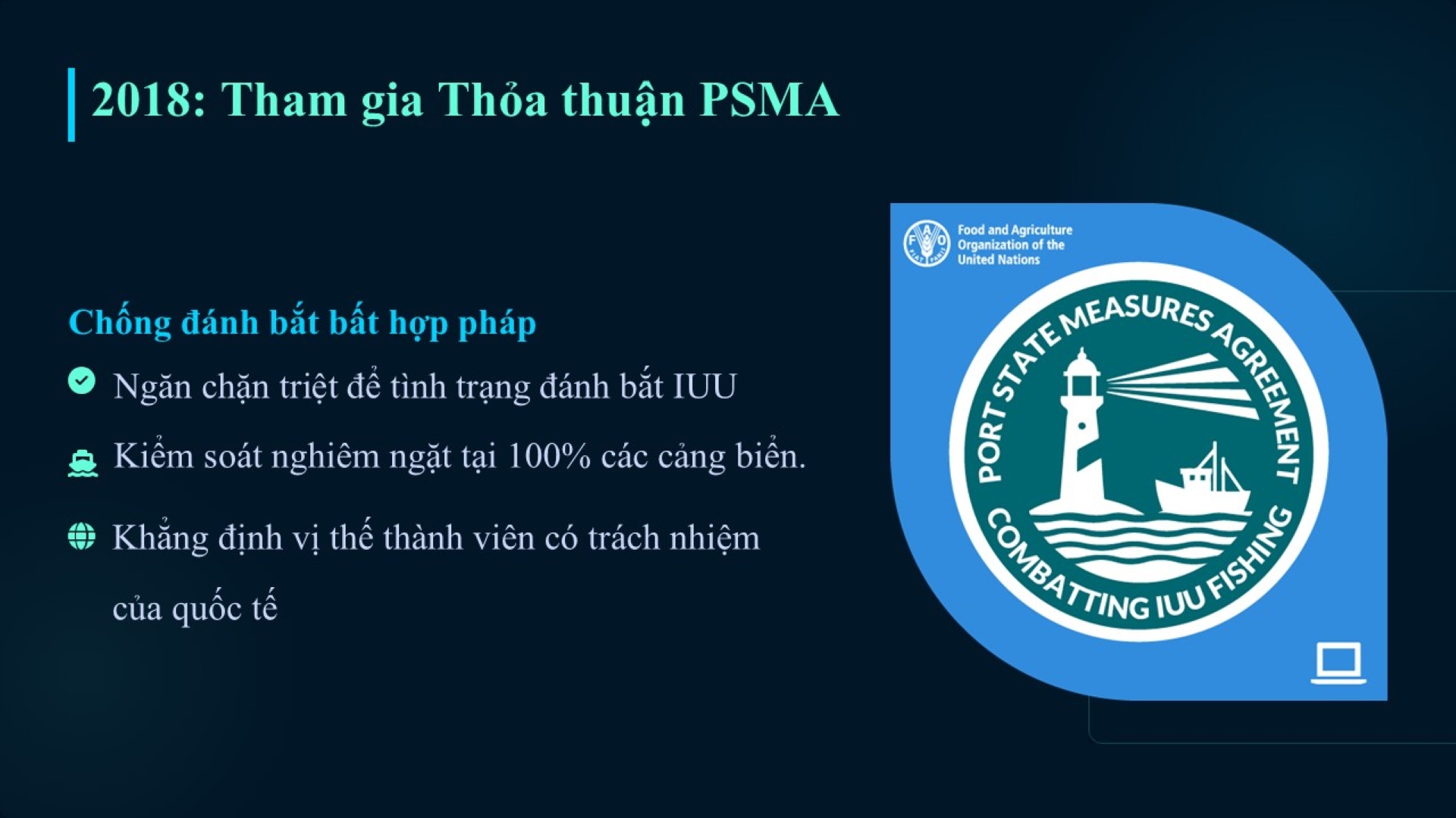 Năm 2018, việc gia nhập Hiệp định về Biện pháp quốc gia có cảng (PSMA) của Tổ chức Lương thực và Nông nghiệp Liên hợp quốc (FAO) theo Nghị quyết số 89/NQ-CP đã đánh dấu một bước ngoặt trong cuộc chiến chống đánh bắt bất hợp pháp, không khai báo và không theo quy định (IUU) (4). Bằng việc tham gia PSMA, Việt Nam không chỉ cam kết kiểm soát đội tàu của mình mà còn sẵn sàng thực thi quyền kiểm soát đối với các tàu cá nước ngoài cập cảng Việt Nam.