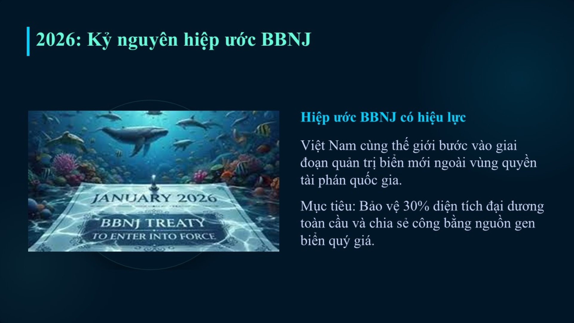 BBNJ được xem là một khung pháp lý ràng buộc được cộng đồng quốc tế kỳ vọng sẽ giải quyết triệt để các thách thức về đánh bắt quá mức và biến đổi khí hậu. Theo đó, hiệp ước này cho phép thiết lập một mạng lưới các khu bảo tồn biển tại các vùng biển quốc tế vốn trước đây gần như không được quản lý - khu vực chiếm tới hai phần ba diện tích đại dương và một nửa bề mặt hành tinh. Mục tiêu cốt lõi của hiệp ước là bảo vệ ít nhất 30% môi trường đại dương vào năm 2030 (còn gọi mục tiêu 30x30), đồng thời tạo ra cơ chế chia sẻ công bằng lợi ích từ nguồn gen biển và chống đánh bắt quá mức (1).