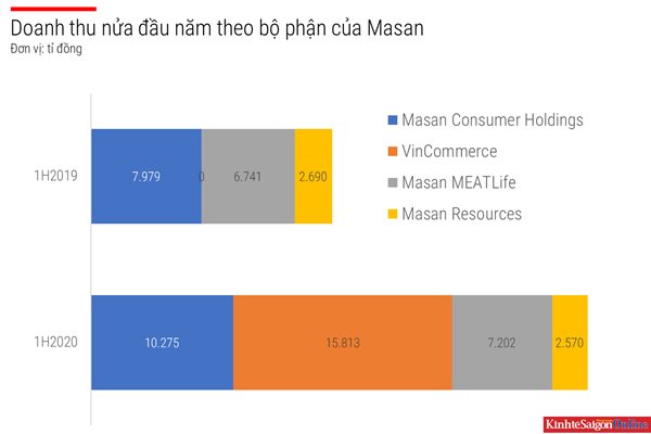Doanh thu tăng vọt là nhờ Masan ghi nhận khoản doanh thu từ việc hợp nhất Công ty cổ phần Phát triển Thương mại và Dịch vụ VCM (VCM), chủ sở hữu của VinCommerce, đơn vị đang điều hành hệ thống siêu thị VinMart, siêu thị mini VinMart và VinEco. Theo đó, Vincommerce mang lại doanh thu 15.813 tỉ đồng cho Masan trong 6 tháng đầu năm, chiếm gần 45% tổng doanh thu toàn tập đoàn.