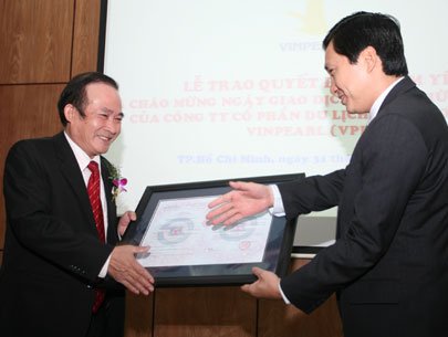 | Ông Nguyễn Trọng Hiền (trái), chủ tịch HĐQT Vinpearl, nhận giấy chúng nhận niêm yết của Sở giao dịch chứng khoán TPHCM - Ảnh: LÊ TOÀN |