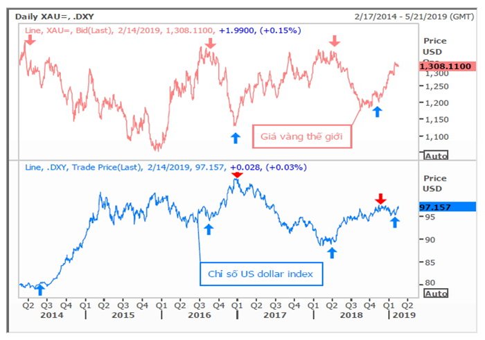 Thứ tư, xu hướng giá vàng quốc tế đang có dấu hiệu điều chỉnh. Sau khi là sự lựa chọn yêu thích của các nhà đầu tư kể từ đầu quí 4-2018, giá vàng thế giới đang thể hiện sự hụt hơi khi đồng USD tiếp tục mạnh lên (căng thẳng thương mại khiến nhà đầu tư yêu thích đồng USD hơn). Các thị trường châu Á cũng tạm thời đi qua thời kỳ cao điểm về mùa cưới, Tết Nguyên đán. Các tín hiệu kỹ thuật cho thấy giá vàng thế giới đang xuất hiện tín hiệu phân kỳ giá xuống, xu hướng nghiêng về giảm nhiều hơn.